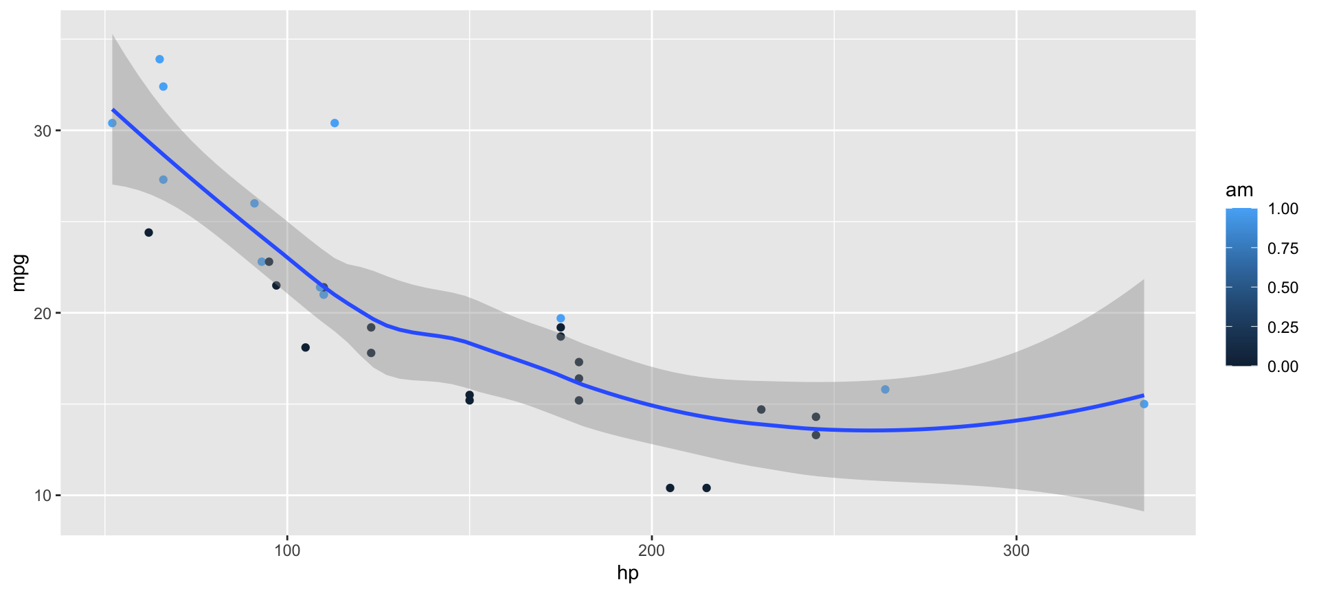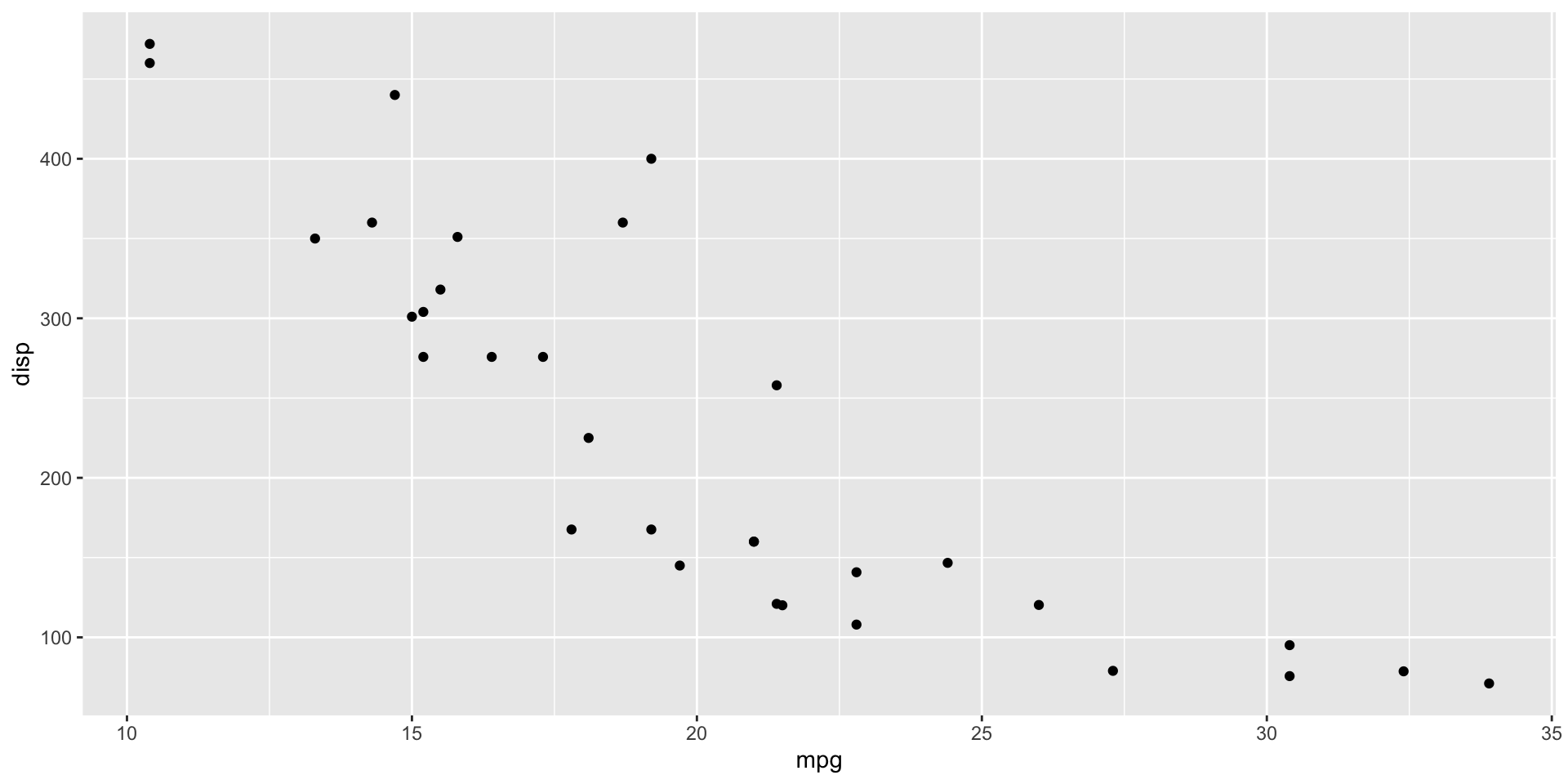 ggplot(mtcars, aes(x=mpg, y=disp)) + geom_point()